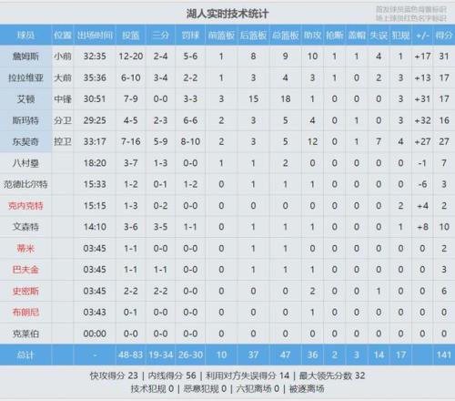 三节打完,湖人102-86领先16分。第四节老鹰一度追到11分,詹姆斯三分球帮湖人止血。末节詹姆斯独得12分,最后4分钟老鹰投子认负。最终湖人141-116大胜老鹰25分。詹姆斯31分9板10助、东契奇27分5板12助、艾顿17分18板。